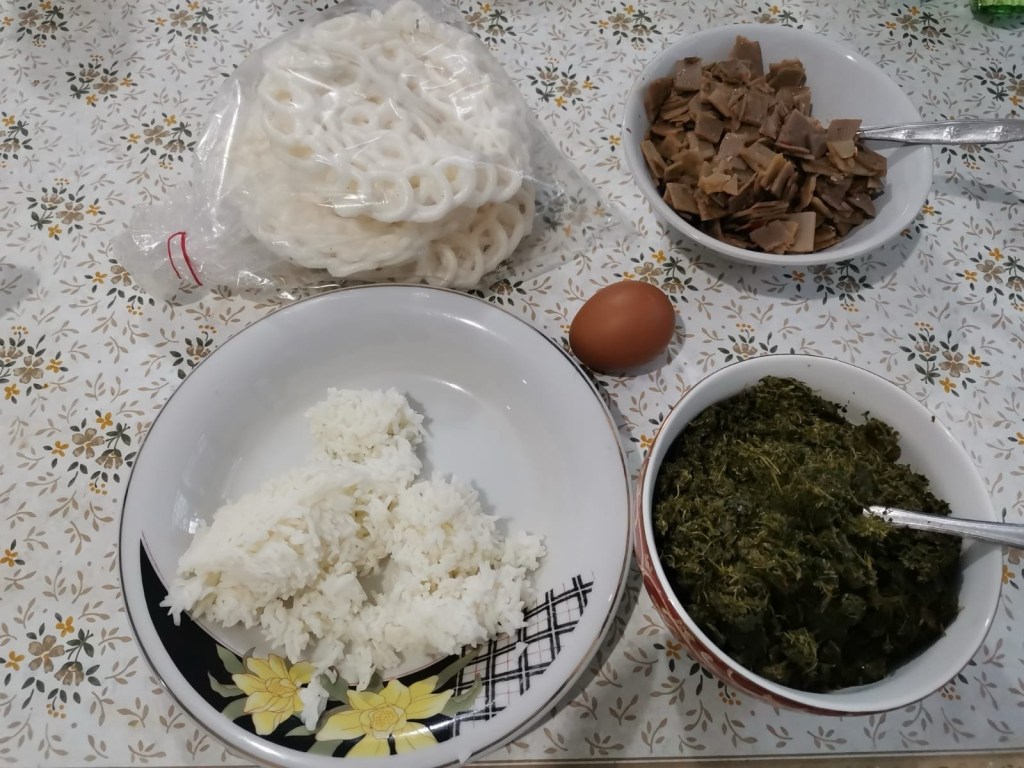 Menu sarapan seorang pensiunan: nasi, telur rebus, galideur (daun singkong ditumbuk; lalu disangray, dikasih minyak goreng sedikit + garam), kadedemes (kulit singkong direndam dulu agar agak mengembang & racunnya terbuang, lalu ditumis), + kurupuk.